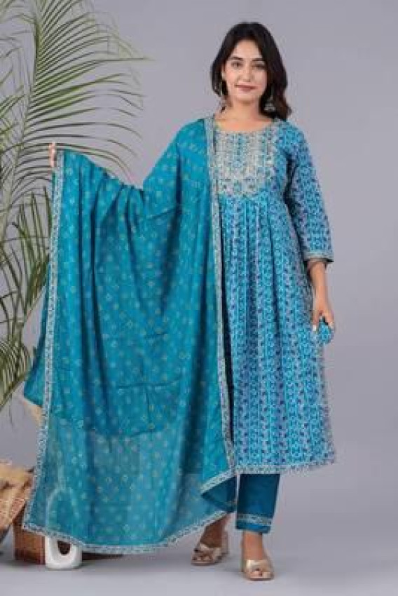 Blue Jaipuri Printed Full Sleeve Anarkali Kurti with Pant & Dupatta Set