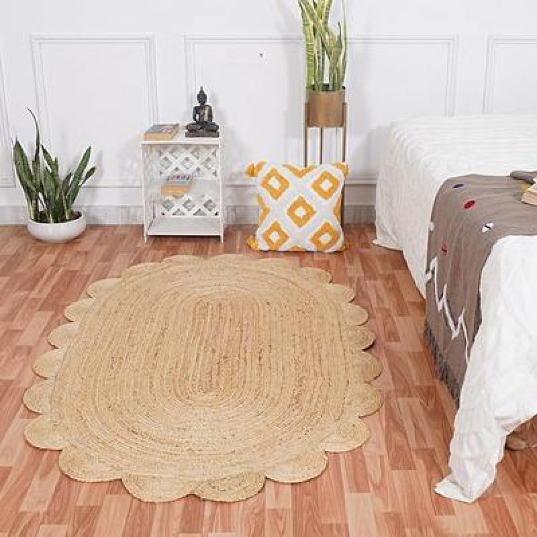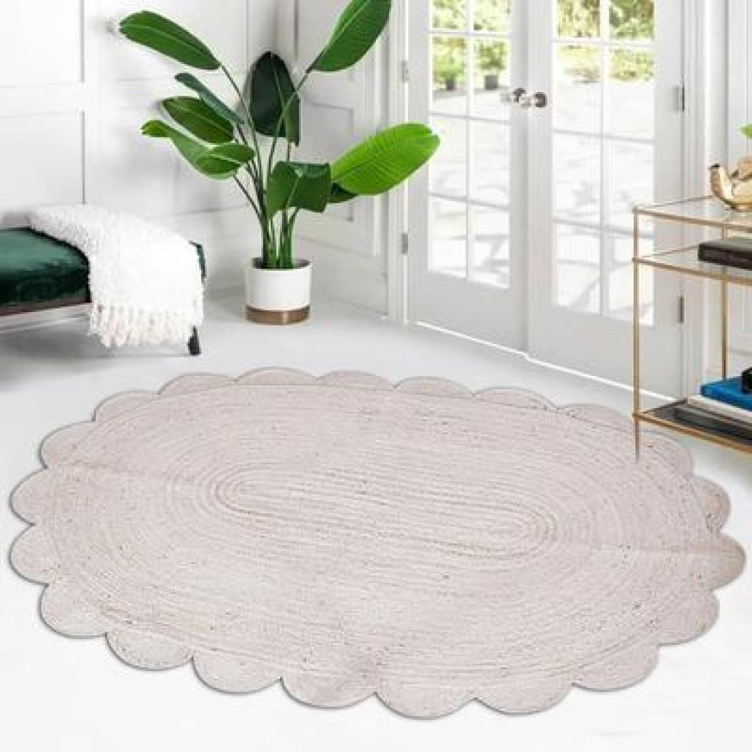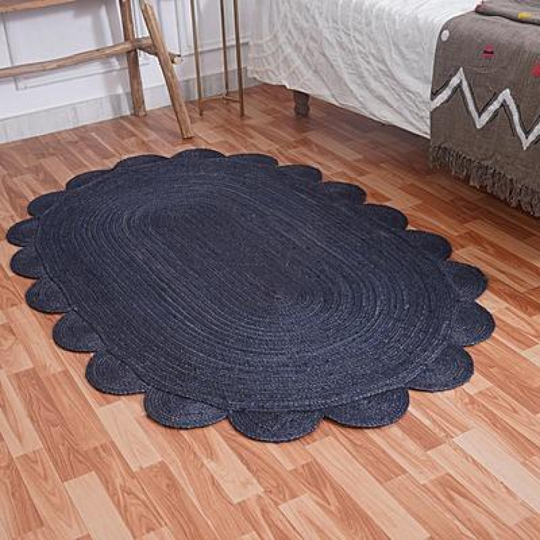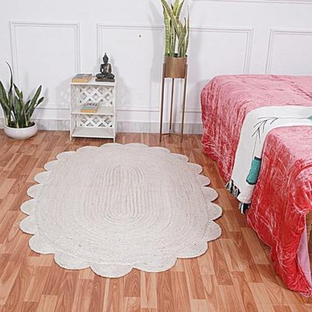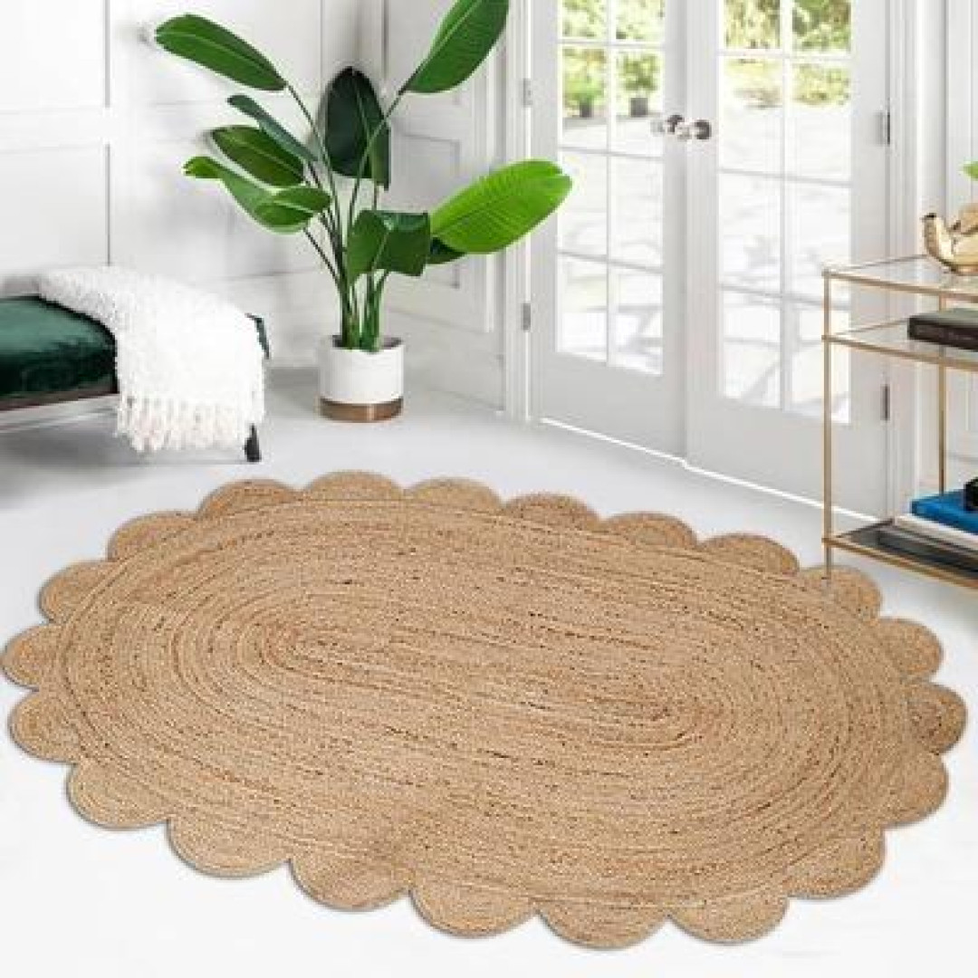 Handmade Braided Natural Jute Oval Shape Scolloped Floor Area Rug-Door Mat Rug