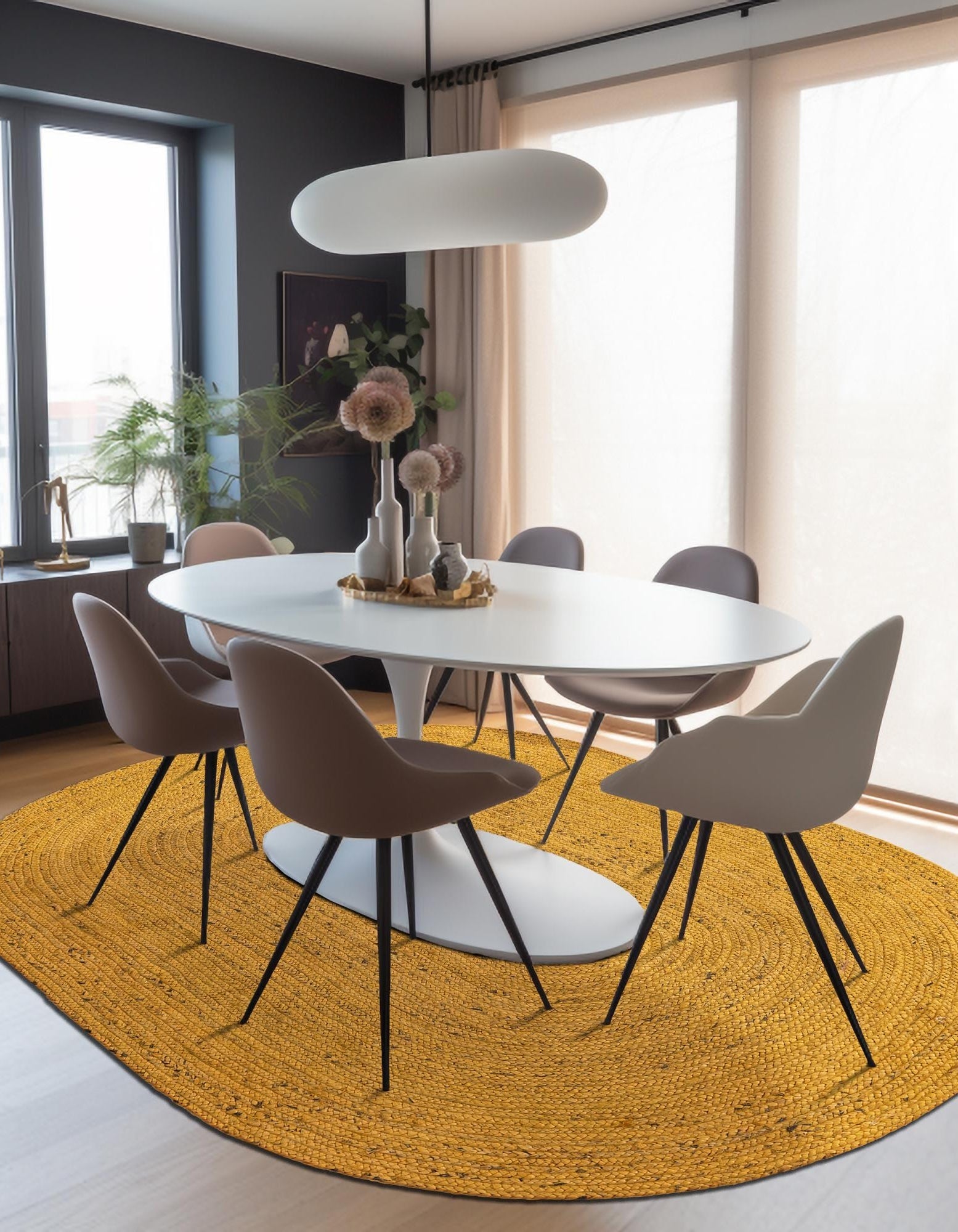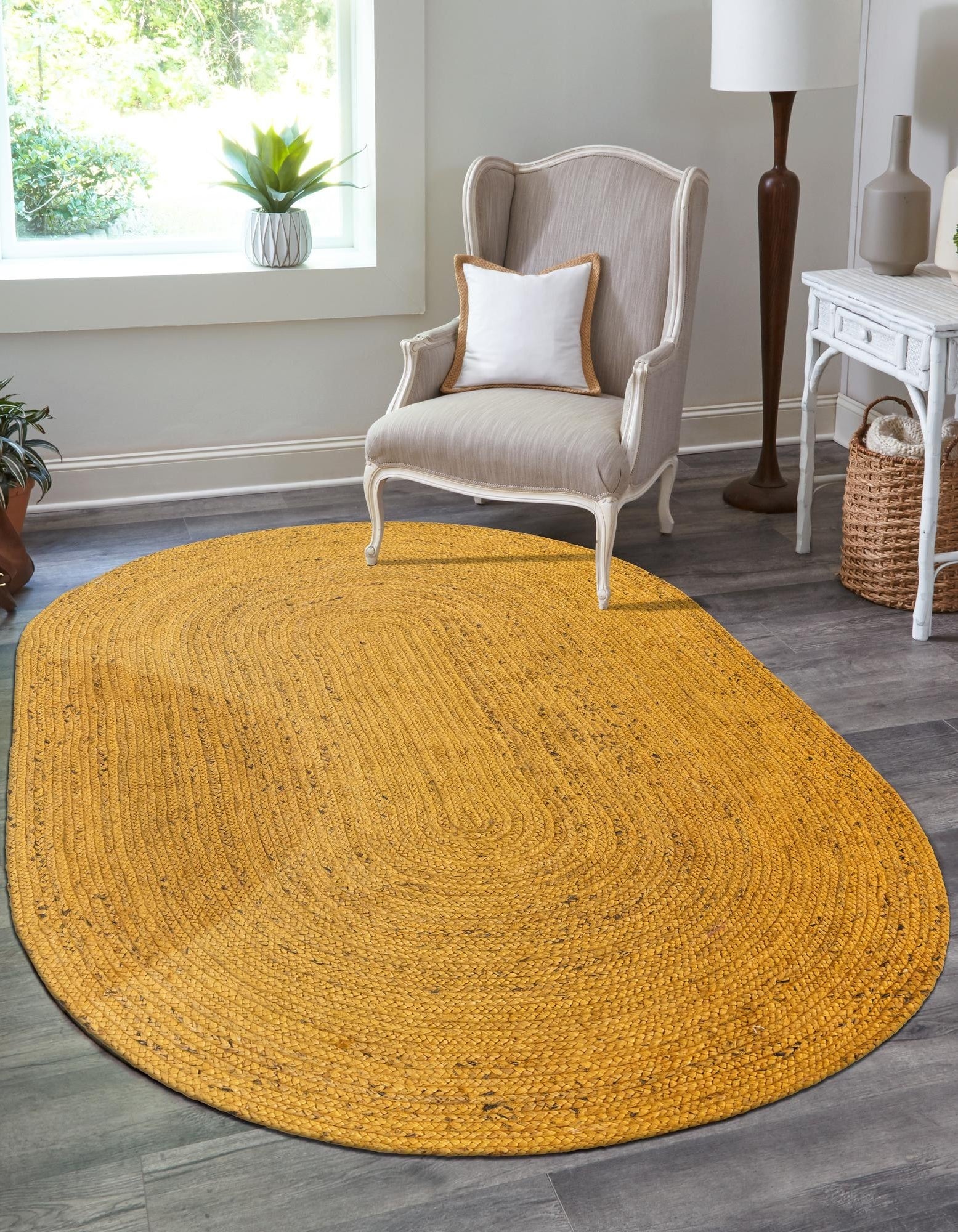 Brighten your home with a splash of sunshine! This Yellow Jute Oval Rug is the perfect way to add energy and a cheerful vibe to any room. Crafted from 100% high-quality natural jute fibers and dyed in a vibrant mustard-yellow tone, this rug brings a warm, cozy feel to your living space while maintaining a rustic, organic look.