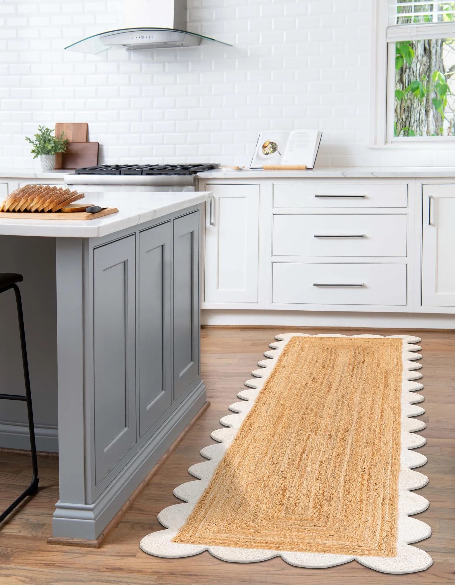 The scalloped white edge design adds a refined farmhouse and coastal charm, making it ideal for living rooms, bedrooms, dining areas, or entryways. Its flatwoven construction ensures easy maintenance and everyday usability while maintaining a natural, earthy look.